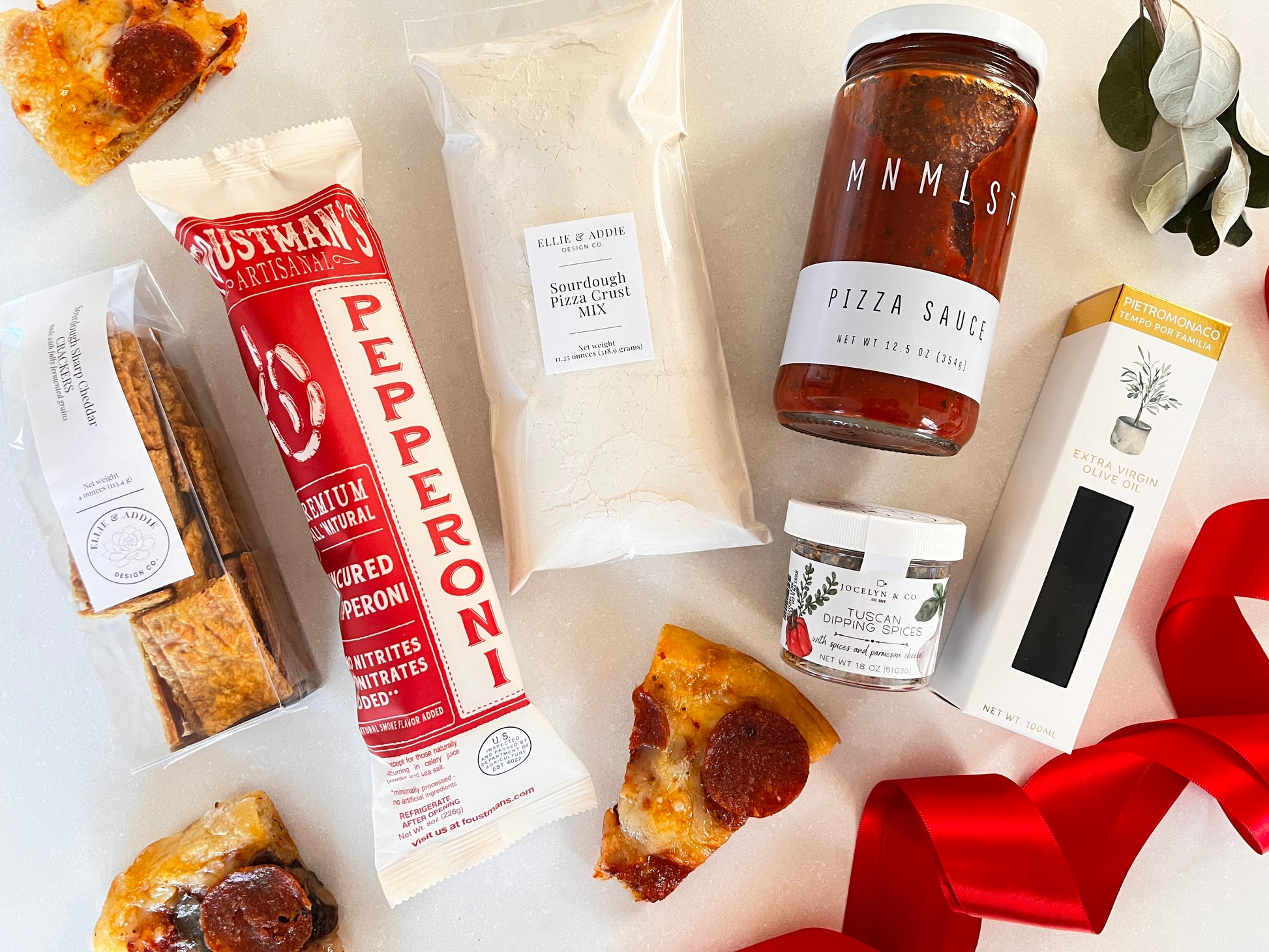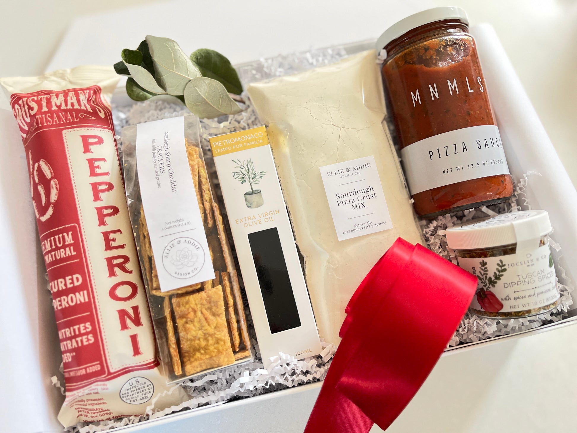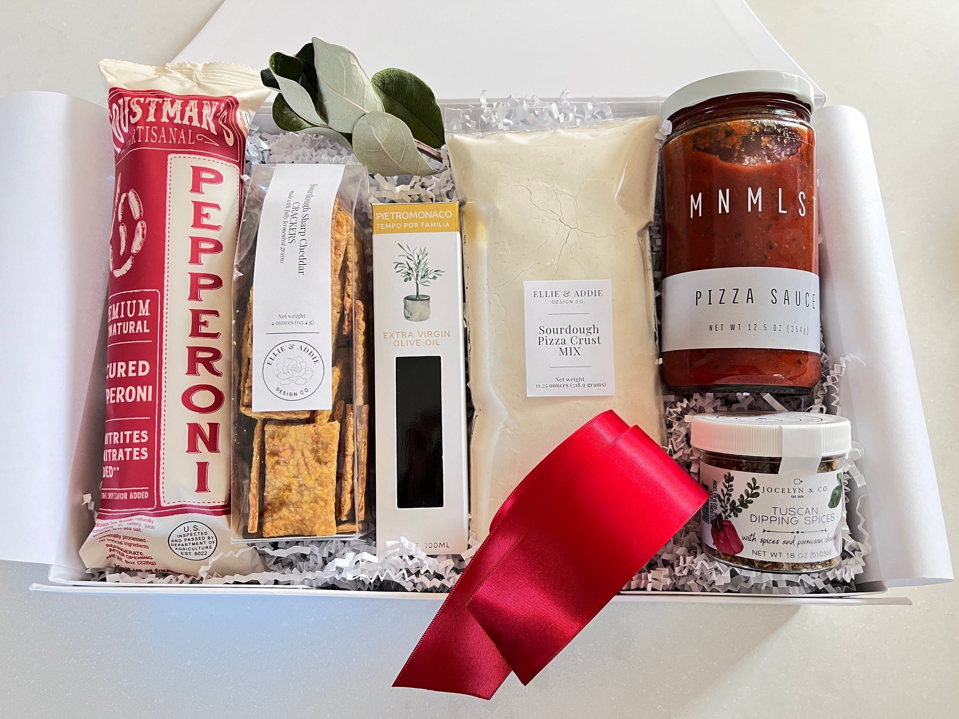 Gift a delicious experience-in-a-box with gourmet pizza night, in this thoughtfully curated collection, including everything you need to make delicious artisan-style slices right in your own kitchen. Featuring premium aromatic flavors, this box transforms a simple meal into an elevated culinary experience perfect for interactive entertaining or gifting a cozy night in that the whole family can enjoy together.